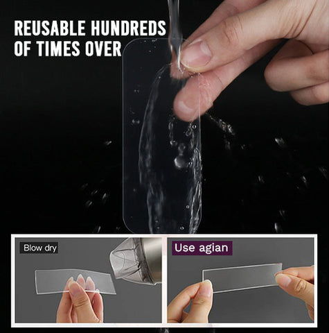 - REUSABLE HUNDREDS OF TIMES OVER: Once removed. this tape can be reused. Simply wash with water and after it dries. the adhesive will return. good to use again. It is cost effective and can be reused hundreds of times. This crystal clear alternative to nails and fasteners that clear tape can stick to almost any smooth. clean and non-porous surface and stay there. which It can hold up to 1 KG (2.2 LBS) on a smooth surface. The double sided tape is coated with adhesive on both sides for easy hang