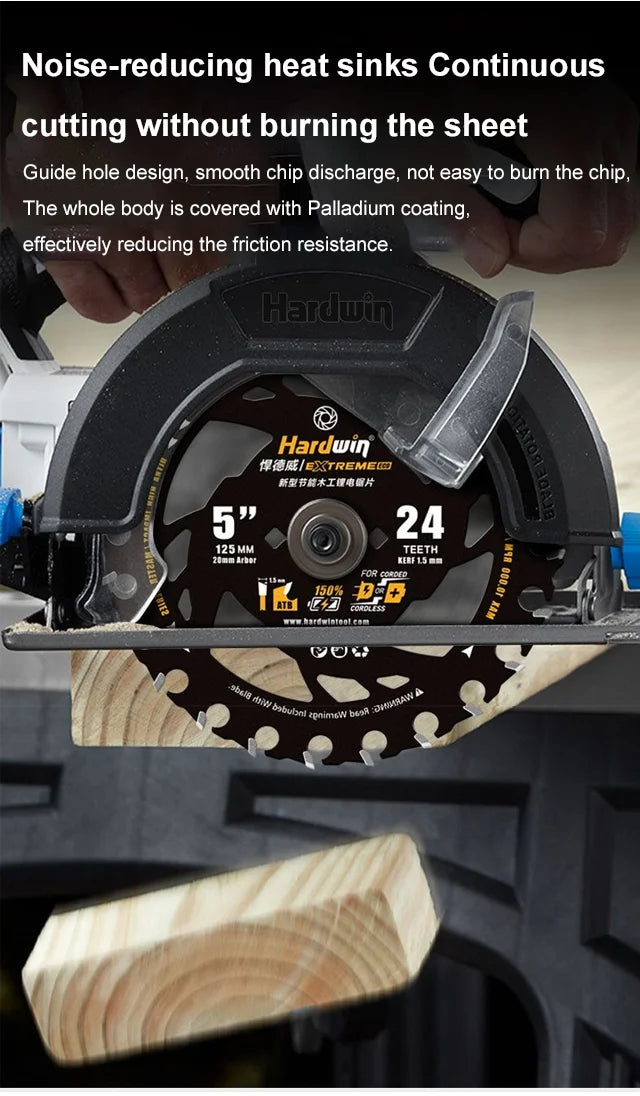 SOUND-ABSORBING HEAT SINKS – This saw blade features built-in sound-absorbing heat sinks that effectively dissipate heat generated during cutting. The heat sinks help to reduce the temperature of the blade. preventing overheating and prolonging the lifespan of the blade.